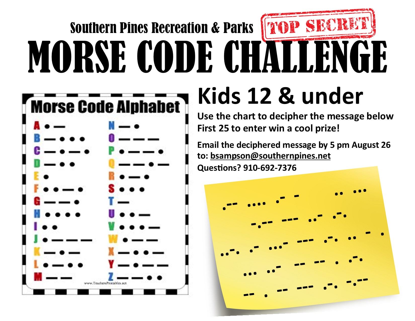 Kids 12 & under use the chart to decipher the message. First 25 to enter win a cool prize! Email the deciphered message by 5 pm August 26 to: bsampson@southernpines.net